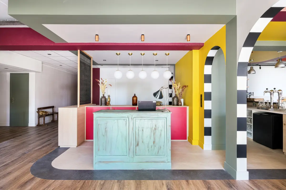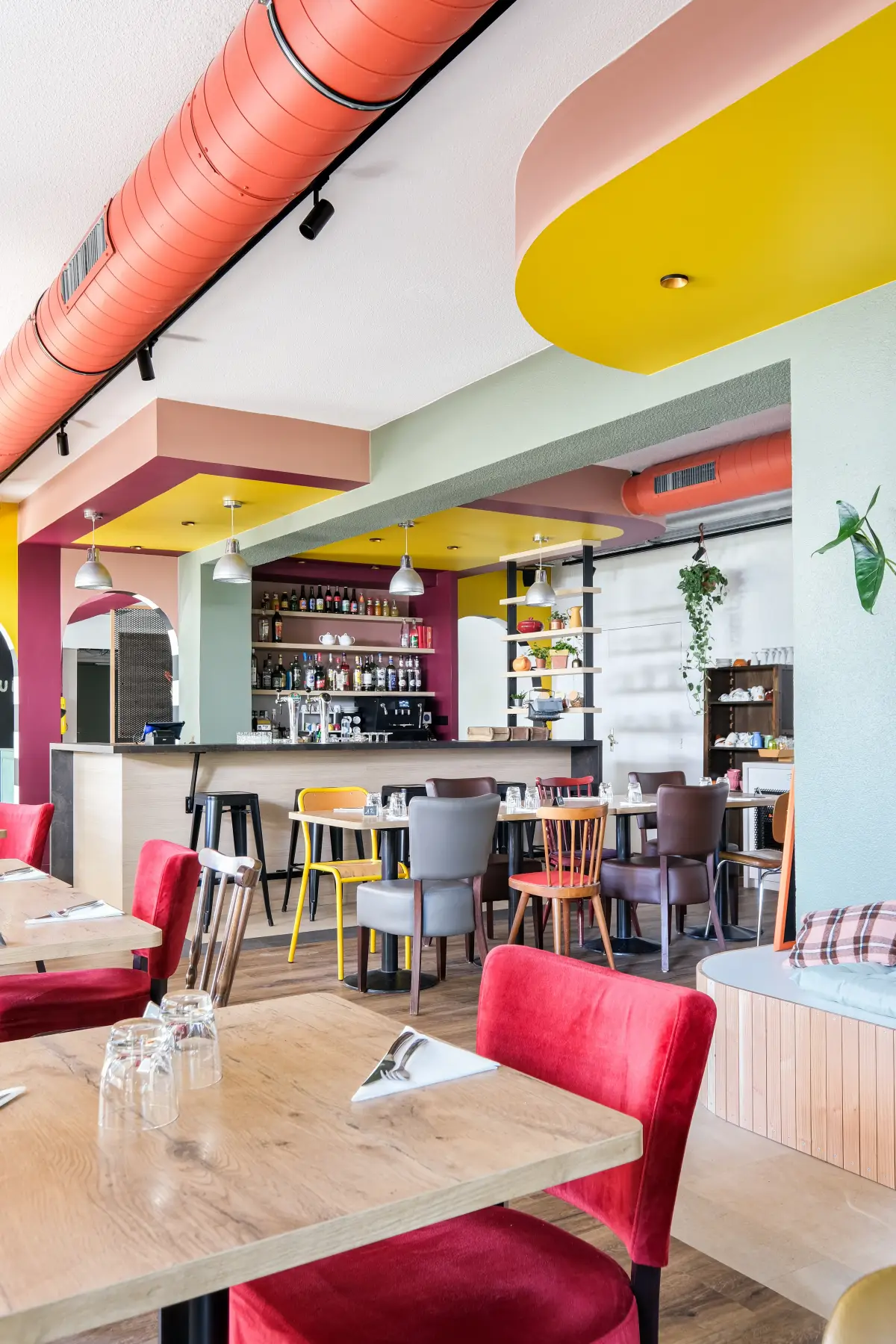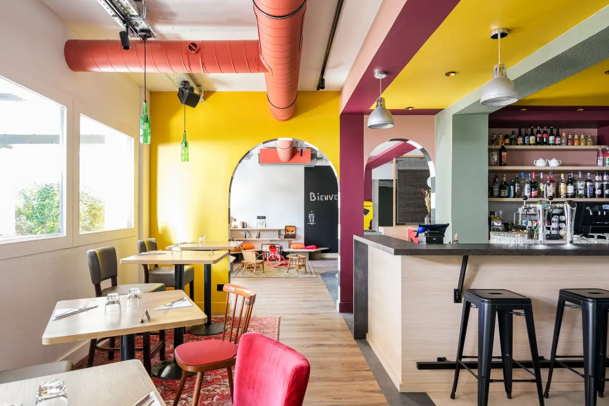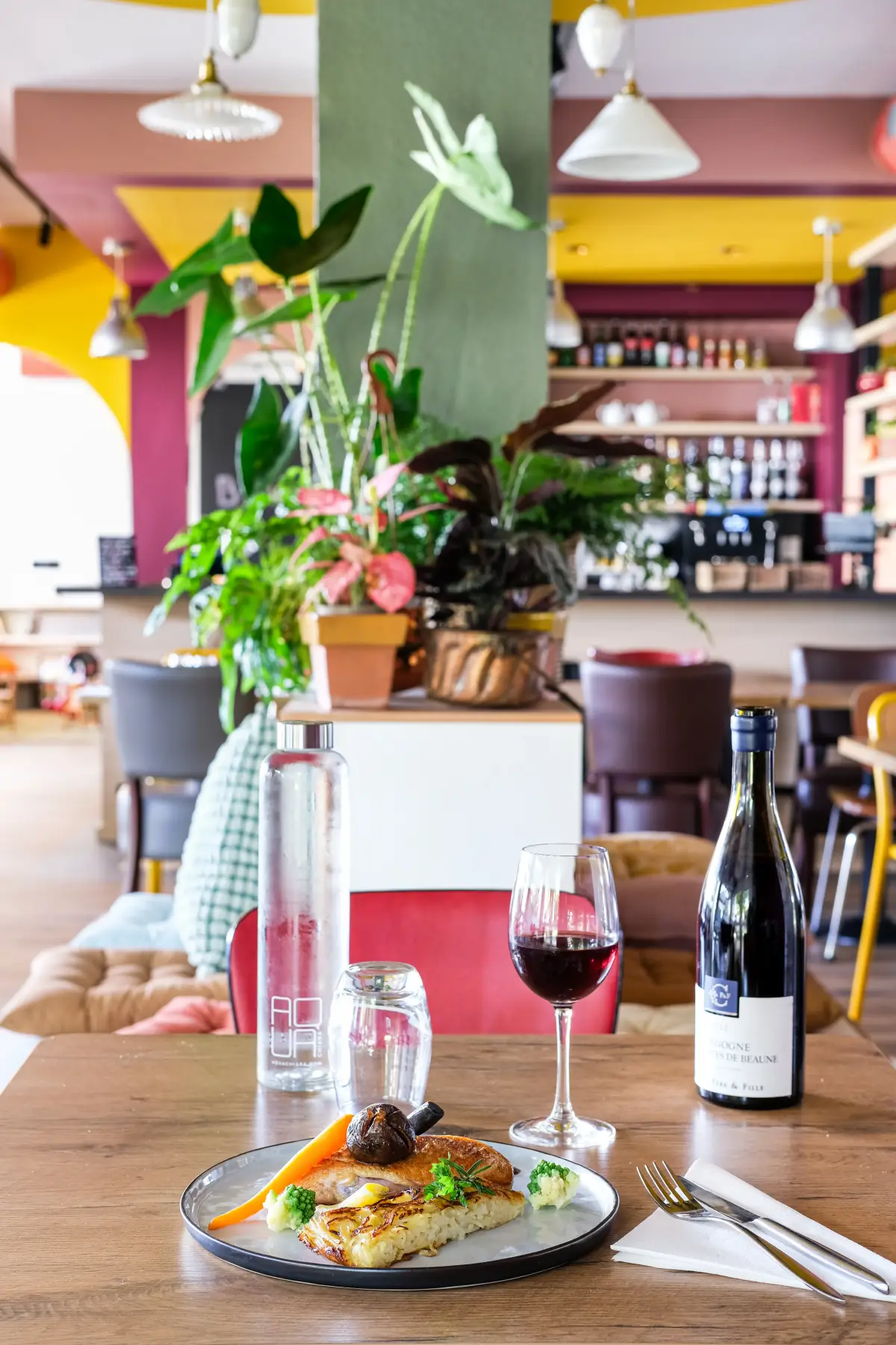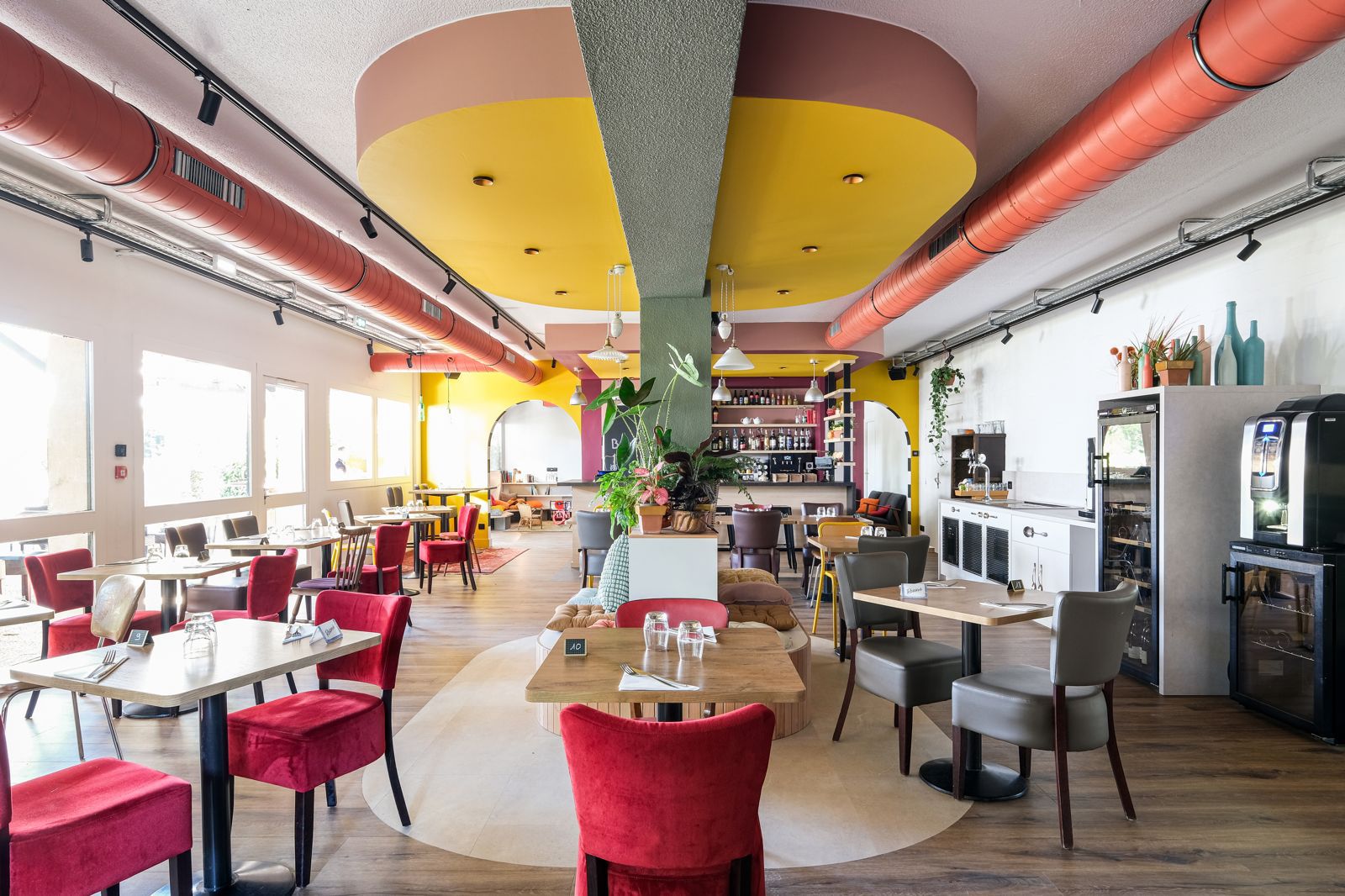 Côté décoration, les dernières rénovations reposent sur une palette de couleurs élégantes et chaleureuses à l’image de son environnement : un rouge tamisé, en référence aux vins locaux, un ocre chaleureux, rappelant les pierres dorées des bâtisses beaujolaises et un vert foncé intense, écho des paysages verdoyants de la région. Le logotype symbolise cet héritage twisté à une touche moderne, il symbolise l’ambiance décontractée du bistrot.