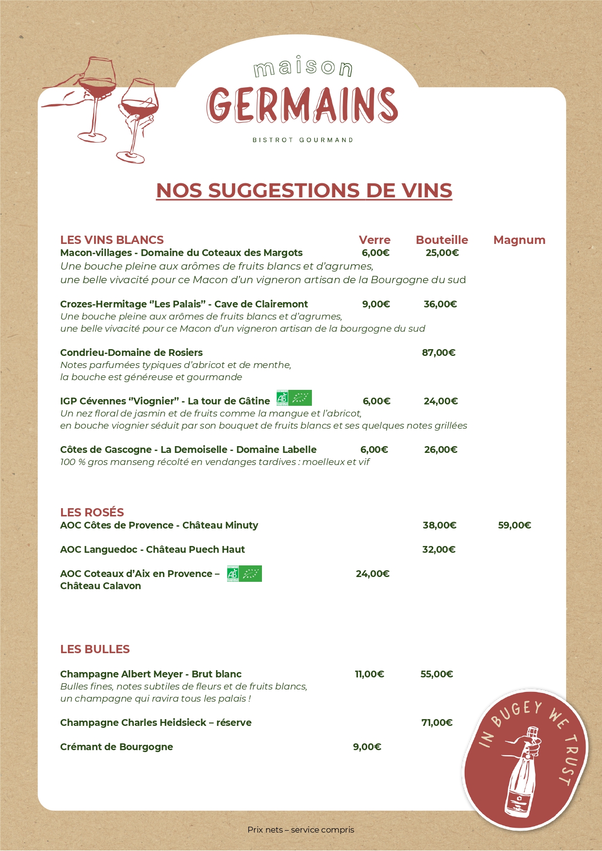 Bienvenue à la Maison Germains, un bistrot à la fois authentique et gourmand alliant modernité et tradition. Niché aux portes du Beaujolais, une attention toute particulière est portée à la qualité des produits utilisés, mettant en avant le travail de producteurs locaux principalement issus de l’Ain.