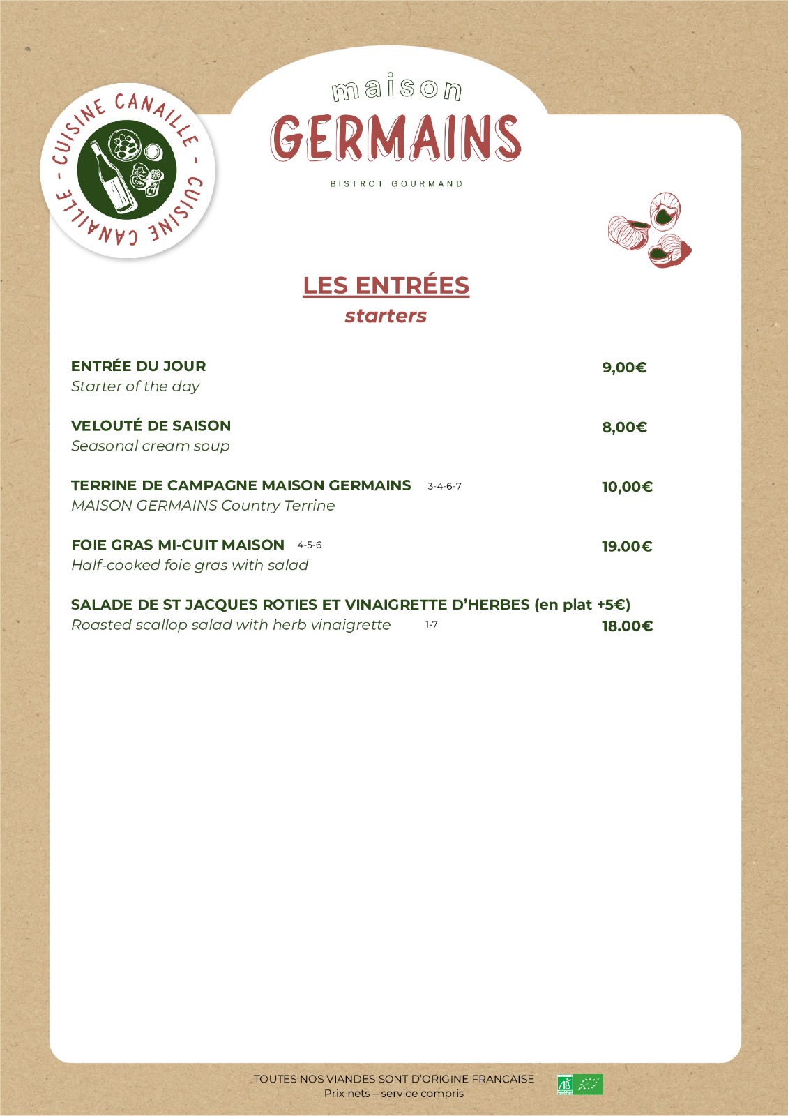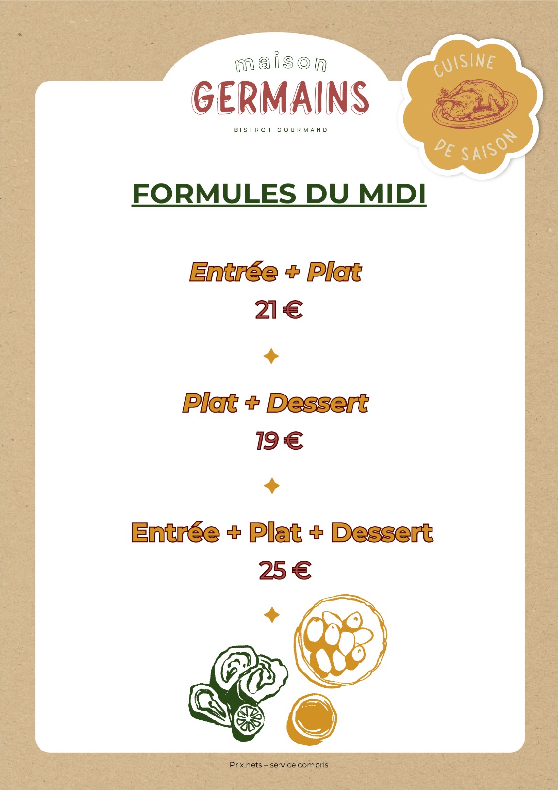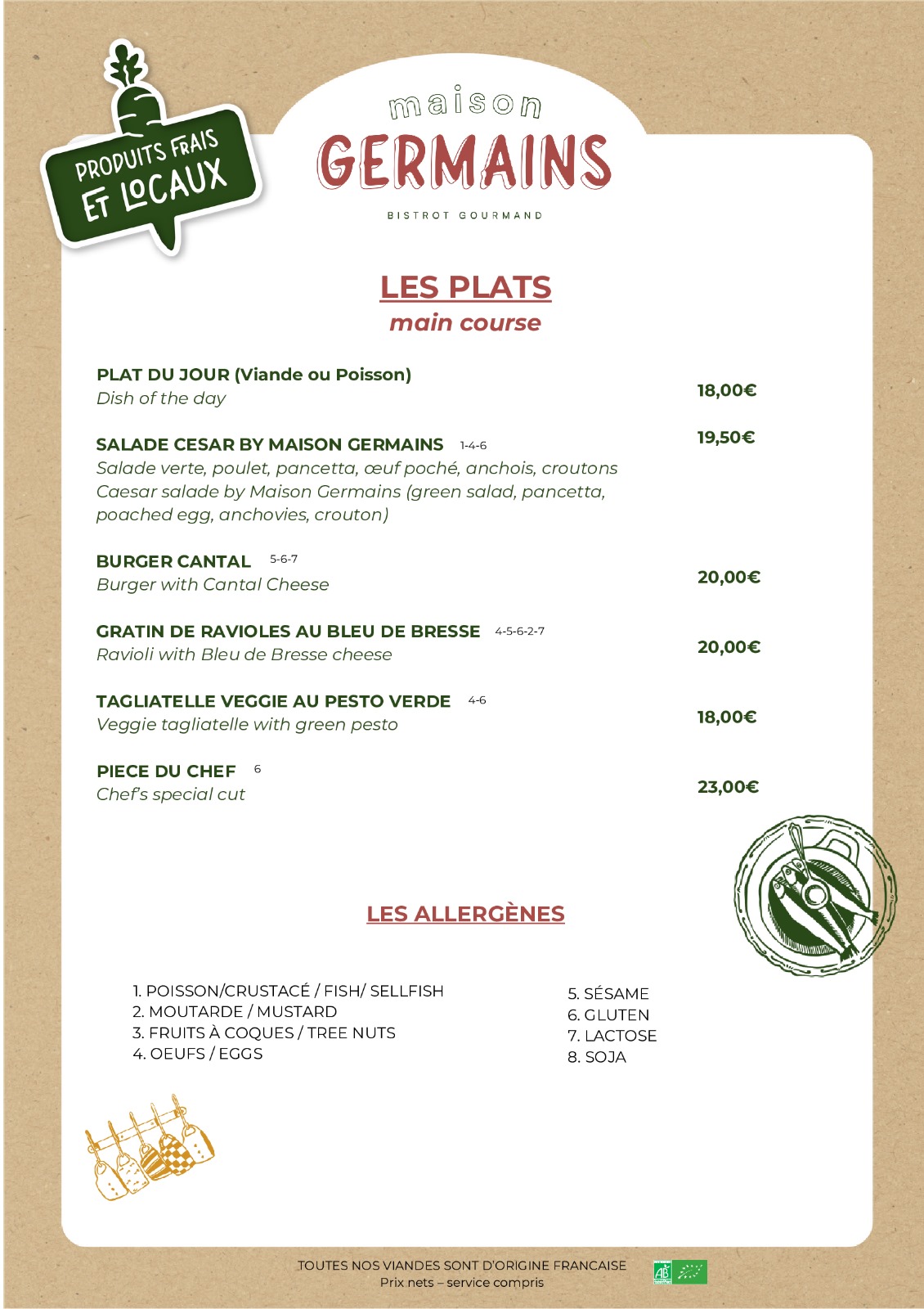 Notre établissement est un lieu où le plaisir de bien manger se mêle à la convivialité d’être ensemble. Esprit de partage, saisonnalité des produits, et créations culinaires composent le mariage parfait pour un moment de qualité. Habitué ou juste de passage vous ne serez jamais déçus par la Maison Germains.