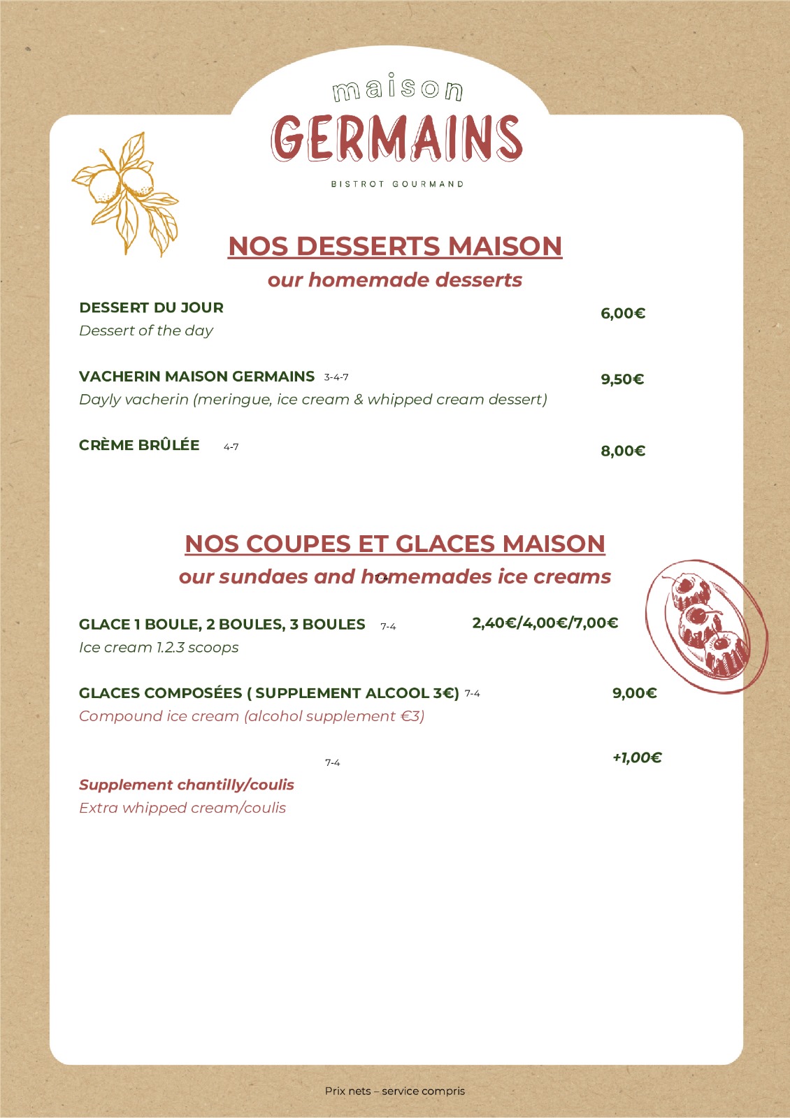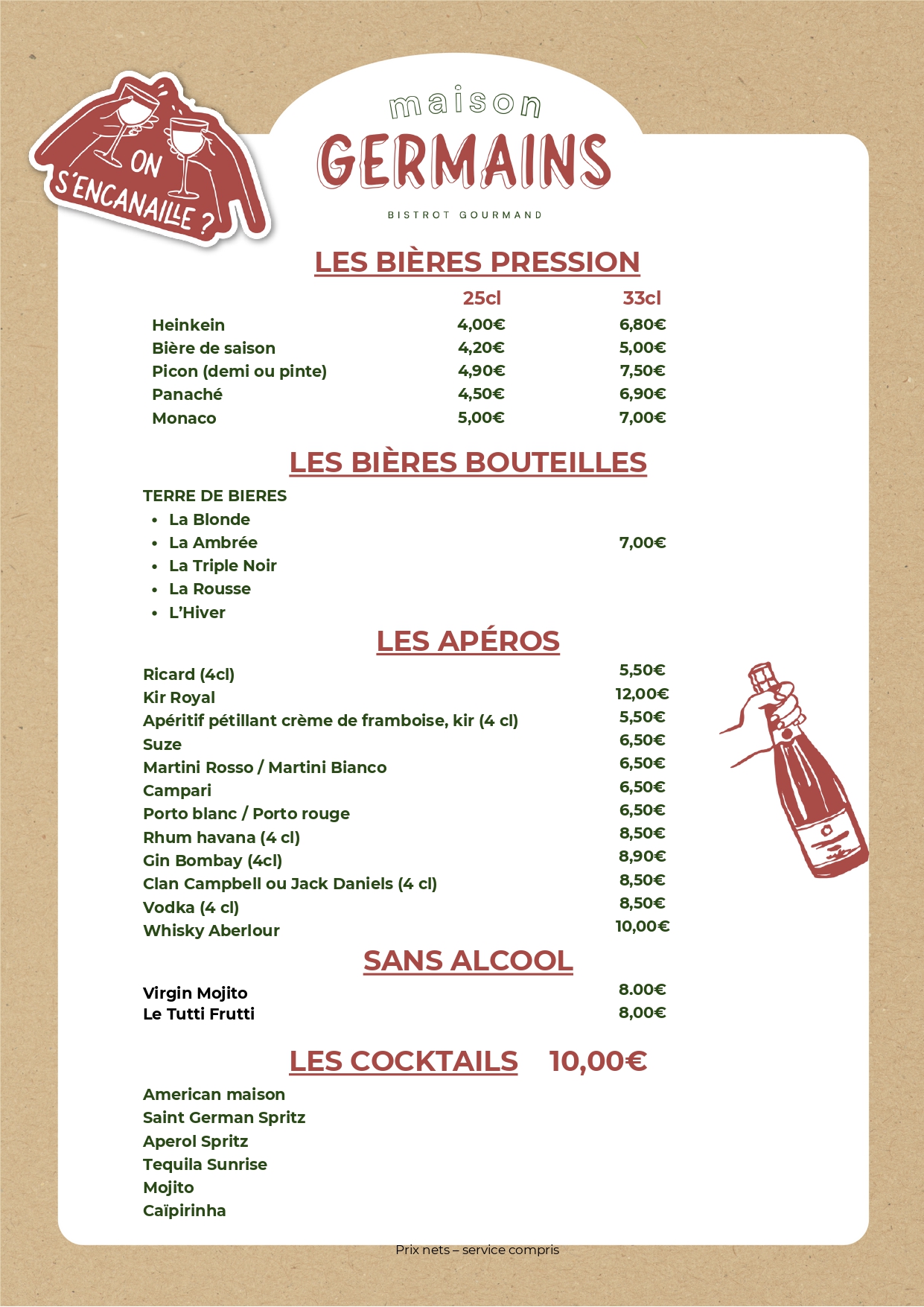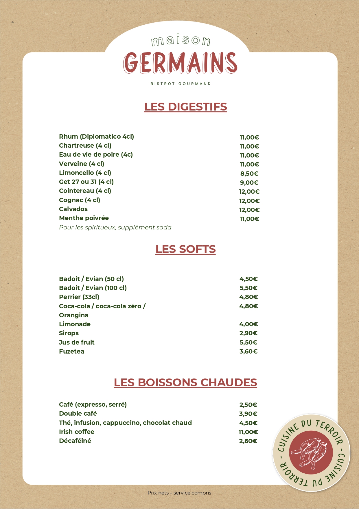 Notre établissement est un lieu où le plaisir de bien manger se mêle à la convivialité d’être ensemble. Esprit de partage, saisonnalité des produits, et créations culinaires composent le mariage parfait pour un moment de qualité. Habitué ou juste de passage vous ne serez jamais déçus par la Maison Germains.